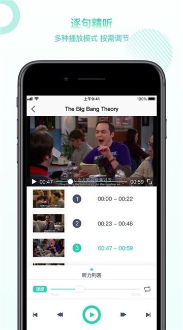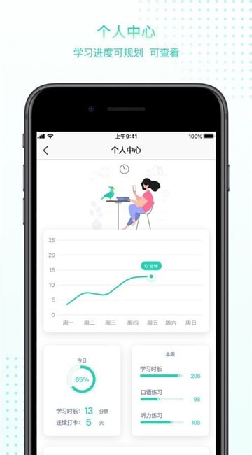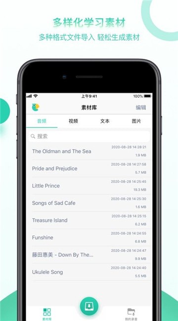 支持多种格式文件自由导入;功能实用全面,支持学习素材拆分成片断学习,录音跟读文件存储;学习素材管理简捷高效,素材按类别导入与查看,跟读录音文件也有单独统一管理页面;学习进度可规划、可查看,支持设置学习时长以及直观查看学习具体情况。