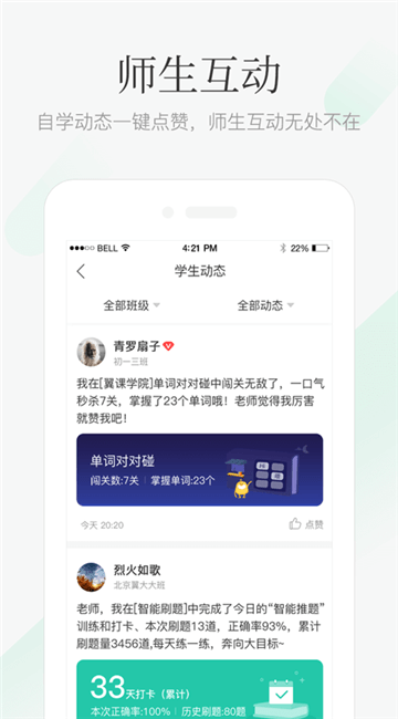 查看全班同学的动态,可以在线进行互动;