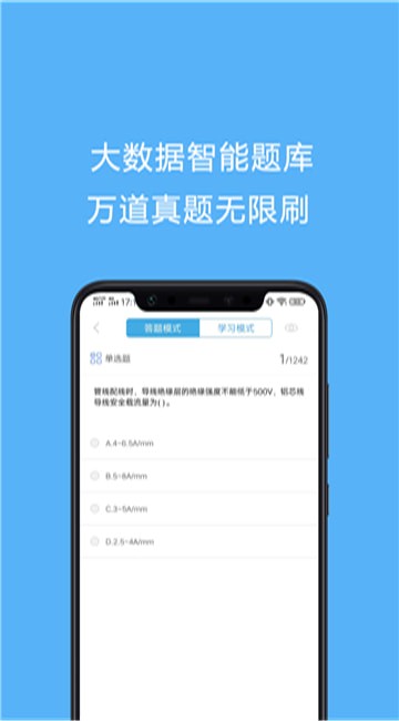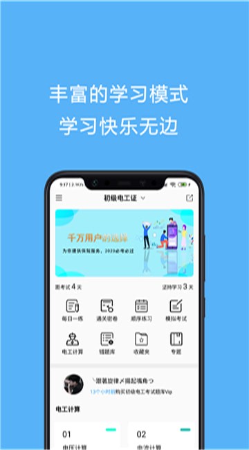 电工证考试题库手机版是一款电工考试的必备刷题神器,这里有丰富的学习模式,任意选择即可进入到习题练习状态,多种练习形式和方案,可以全方位的强化和实践练习,让考生能够享受到学习的快乐,电工证考试题库app拥有万道真题,能够无限刷题,大数据智能刷题更流畅,即刷即批阅;该应用为考生提供了计算公式,这样就可以随时学习和记忆公式,告别死记硬背的记忆方式,系统每天为用户推送一定量的题目,每天坚持锻炼就能进行题目练习,一键选择开始做题,就可以快速练习题目。