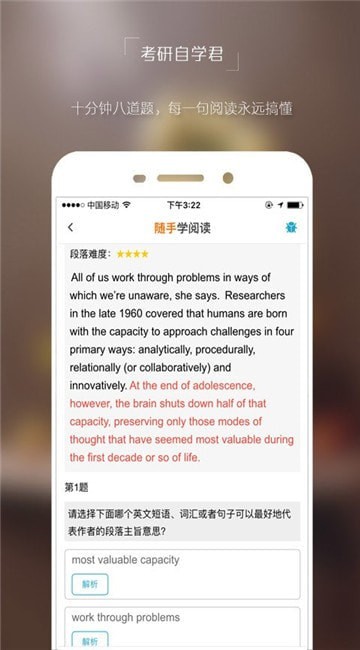 2、手机使用频率高且具有自主学习愿望的人群打造的手机应用。考研自学君app基于科学分析的英语学习内容;