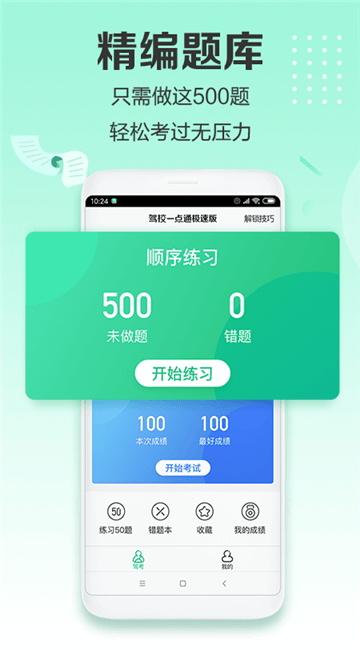 驾校一点通极速版app是驾校一点通出品驾考学习应用,帮助考生轻松学习驾考知识;科目一、科目四的学习方案都有带来,帮助解决在学习中遇到的所有问题,能够顺利通过各科目考试,顺利取得驾照;精编500道驾考上机习题,让你摆脱盲目刷题模式,能够有序学习上机习题,并熟悉交通知识;融入了各省市常考题目,让学员在学习驾考知识的时候,可以根据省市的不同,精准选择合适的题库,在线刷题练习;常考题、易错题等都有统计,覆盖知识点非常全面,让你轻松学会每道题,并且还能高效记忆习题答案。