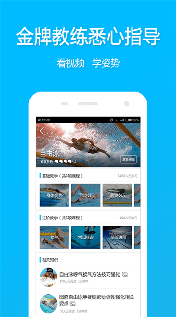1.游泳教学指导:整合精选游泳教学的文档、动图以及视频供用户自学、交流;