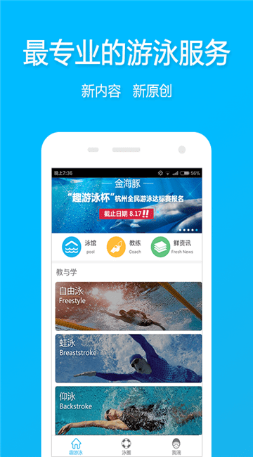 趣游泳app是一款游泳运动学习软件,在这里为你提供做专业的游泳服务,你可以在线随时观看自由泳、蛙泳、仰泳等各种泳姿的教学视频,金牌教练悉心指导,还有专业的游泳社区,你们可以约游泳、论技巧、晒美照等,快来单机8下载使用吧!