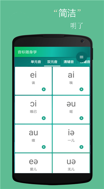 音标小助手安卓版是一款用于学习英语音标知识的应用,非常适合刚开始学习英语知识的朋友使用;软件将音标学习分为了四大类,方便让学员循序渐进的学习音标知识,掌握每一个音标在实际应用中的拼读方法;有着美观的卡片式内容设计,内容简洁明了,使用手机也能很方便的学习知识;并且在音标小助手手机版内,还有音标教学视频可以观看,跟着教学视频一起学习,轻松掌握各个音标的发音方法,知道学习音标发音;app采用的是正宗的美式发音,不管是学龄前儿童,还是刚接触英语学习的初学者,都可以使用app简单学习。