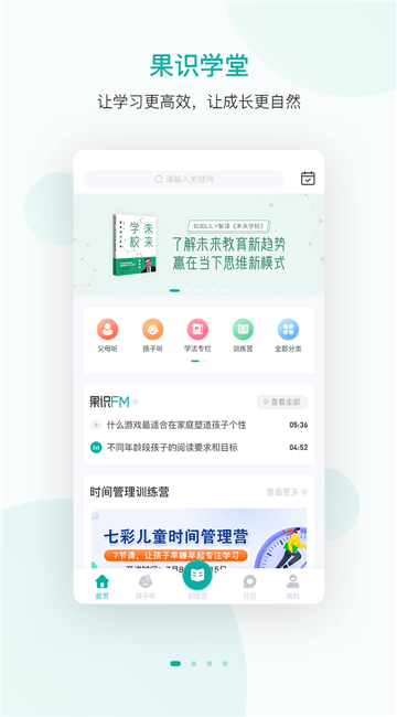 果识学堂免费版涵盖精选书籍解读、音视频课程、训练营、直播课程等优质资源,果识学堂app为用于提供以家庭教育为核心的一整套线上线下服务。