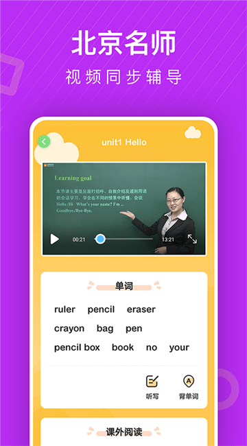 课程同步,小学英语同步辅导免费版有效提高孩子课堂知识回顾锻炼,家长可同步辅导课程。