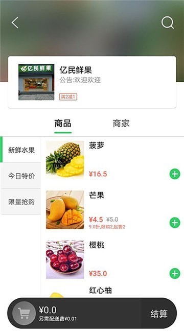 3、可以选择附近的商家,加入购物车或者直接下单,通过使用满减、折扣等优惠功能,享受极致优惠,同时也支持配送和到店自提俩种模式。