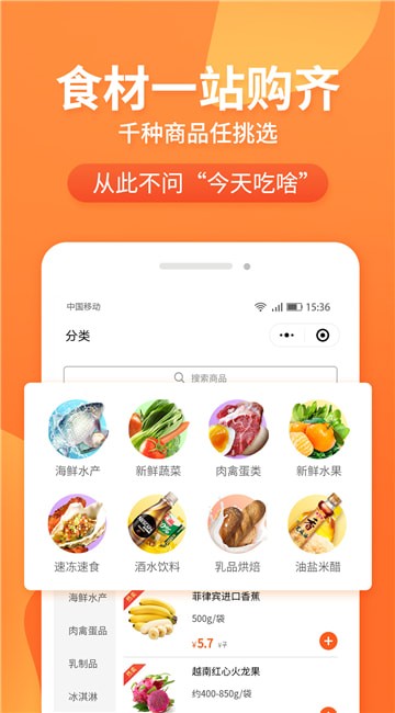 4、掌中下单购买新鲜食材,为您快速配送,在家就能购买到需要的食材;