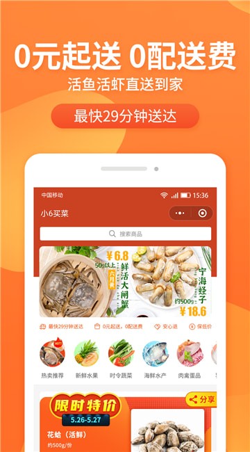 小6买菜最新版是一款手机在线购物的软件,在这里为宁波人提供了买菜的福利,用户可以随时在线购买蔬菜、肉类、海鲜水产、水果等生活用品,下单之后最快29分钟送到家,新人还能享受专有的福利,快来单机8下载使用吧!