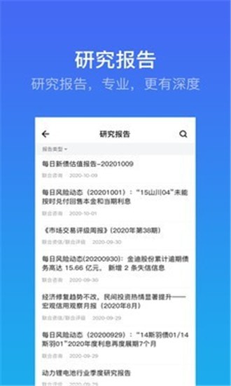 研究报告:提供丰富专业的研究报告,帮助用户深入了解债市情况。