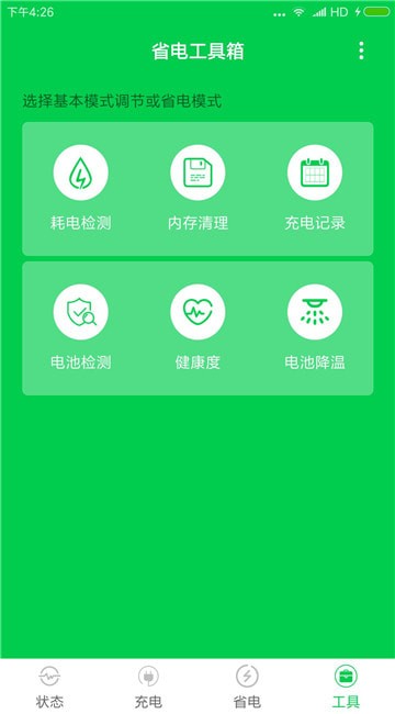 4、省电工具提供:耗电检测,内存清理,充电记录,电池检测,健康度,电池降温。