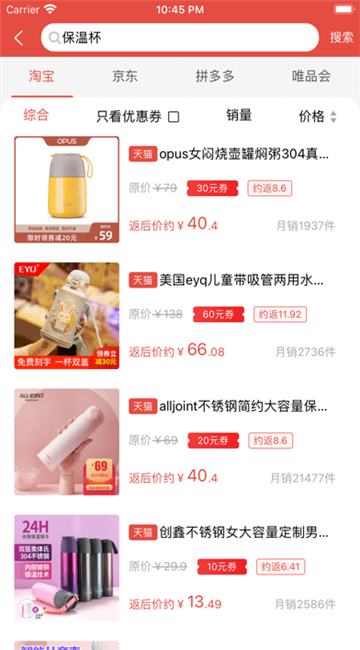 一键搜索淘宝、天猫、京东、拼多多、苏宁易购等优秀电商平台优惠信息。