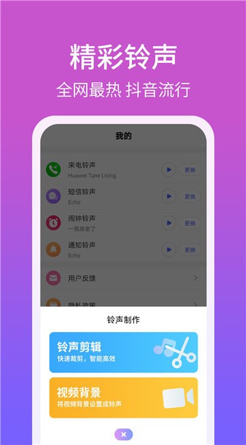 手机铃声,是一个集铃声、彩铃、铃声裁剪为一体的手机来电铃声视频铃声大全APP。热门来电、短信、闹铃一键设置。