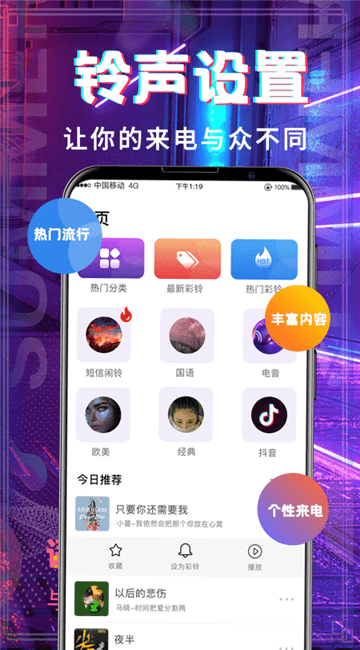 无需电脑,手机即可直接更改铃声,单击播放并通过按钮完成设置,非常简单。