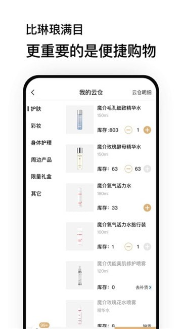 1、以化妆品商城为特点,能够随时随地查看护肤品来源。