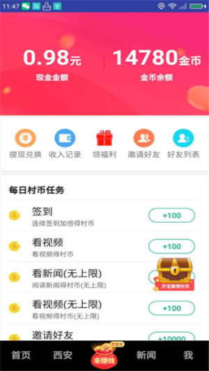 在来赚钱中,可以查看到用户个人通过观看视频与资讯赚取到的收益;