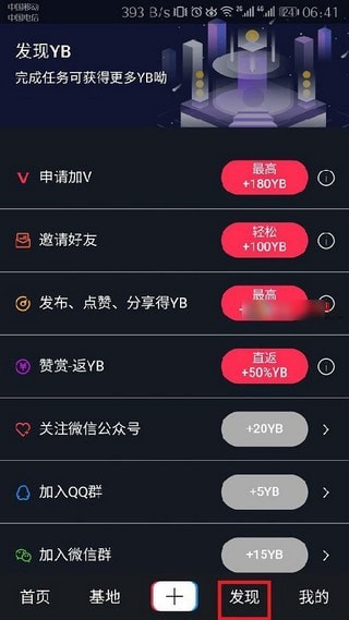 进入“发现”页面,完成各种任务即可,注意完成任务得到的YB需要进入“基地”页面领取,48小时不领取将停止激励。