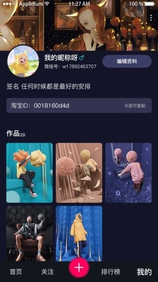 5、自定义个人主页,每个人可以对自己主页的背景图案、个性签名和昵称等进行自我的编辑;
