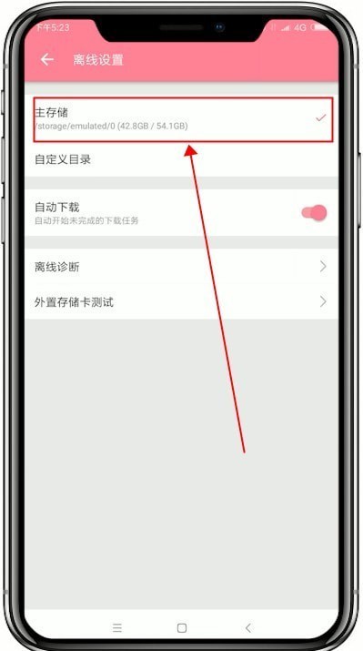 4、进入【离线设置】界面后,可以看到界面上方有个主存储,主存储下方的路径就是下载视频的保存位置。
