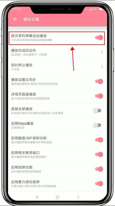 4、点击【首页单列弹幕自动播放】,将其后面的红色按钮点击成灰色即可关闭首页自动播放弹幕。