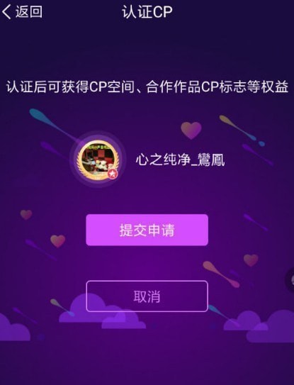 3、在其中填写对方的配音秀ID,我们就能够提交申请等待审核,只要对方也同时输入你的配音秀ID提交申请,就可以通过CP认证了!