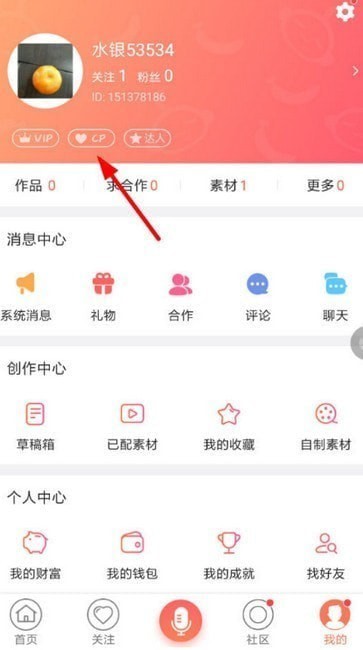 2、然后点击进入到配音秀的个人中心,选择其中的头像下方的“CP”功能,这样就可以进行申请认证了。