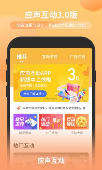 应声互动app是一款全新的广播电视互动手机应用软件,应声互动app实时推送与广播节目相关的文字、图片、视频等信息,解决你听广播“只闻其声、不见其形”的苦恼,感兴趣的朋友快来下载吧!
