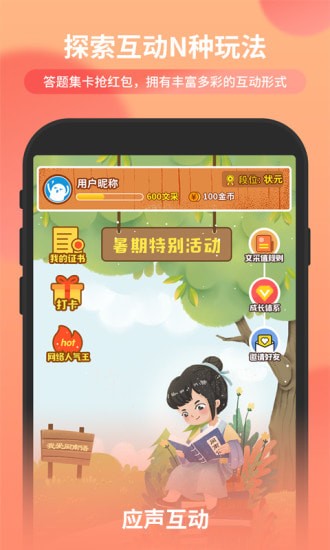 应声互动app是聆刻互动(北京)网络科技有限公司研发的一款帮助用户与广播电视节目实现互动的具有服务、娱乐和社交功能的软件。