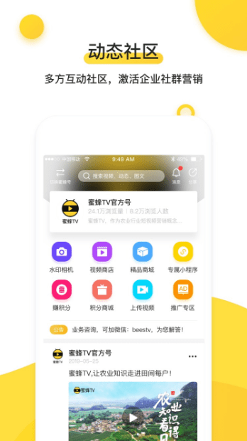 蜜蜂TV是一款专门面向广大企业的短视频营销平台,主要为了让各类企业能够拥有自己专属的营销手段,通过短视频的方式宣传企业品牌、企业产品以及企业服务。