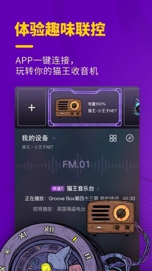 APP一键连接,玩转你的猫王收音机。妙播技术是猫王收音机独有的创新收听体验,曾在2017年荣获美国CES创新大奖!