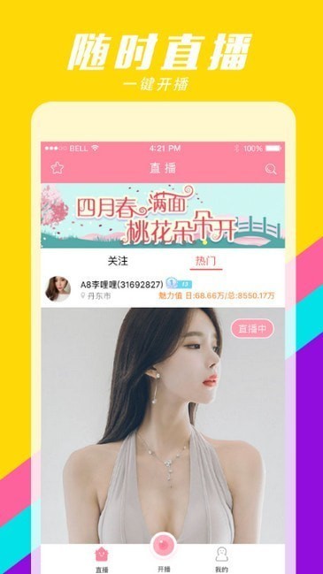 桃花直播下载安卓最新版是由北京思享时光科技有限公司推出的一款掌上娱乐直播软件,该平台以极具趣味性的线上视频互动社交为出发点,结合时下年轻用户群体的实际互动视频交友需求,提供智能美颜、多屏互动、一键直播、超炫礼物、互动交流、超多活动等一系列特色功能。可让用户线上关注心仪主播,送礼物、聊天评论,观看精彩直播带来的乐趣,同事还能结交志趣相投的好友,让生活更加乐趣~