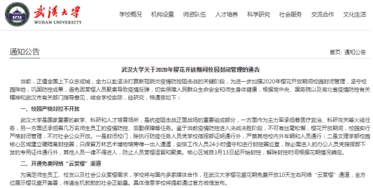 3月12日,武汉大学发布通告,为避免因赏樱人员聚集导致疫情反弹,武汉大学樱花开放期间,校园将实行严格封闭管理,不对外开放。与此同时,为全方位展示樱花盛开美景,满足师生员工、校友以及社会公众赏樱需求,学校将与国内多家媒体合作,在武汉大学樱花盛花期免费开放10天左右网络“云赏樱”通道。具体信息学校将提前通过微信发布。