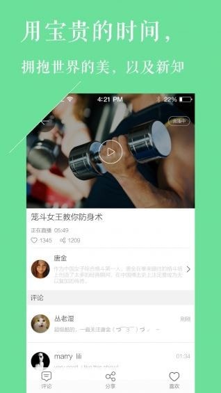3.具备了直播内容的精选、分享到第三方、主播及预告的推荐、以及主要的直播功能