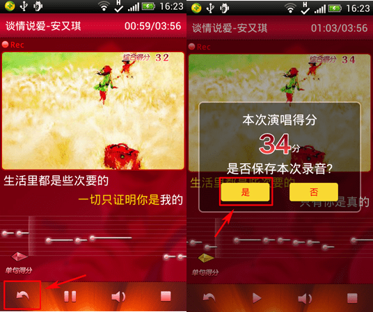 在演唱界面,自己进行演唱,当自己演唱完成后,点击【返回】按键,最后在显示出的界面按【是】按键即可。