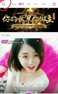 然后进入主页后我们会发现有很多主播在直播中,我们随便选取一个点击进入,进入后我们发现左上角是主播的昵称,但是我们要记住红色圈中的ID号