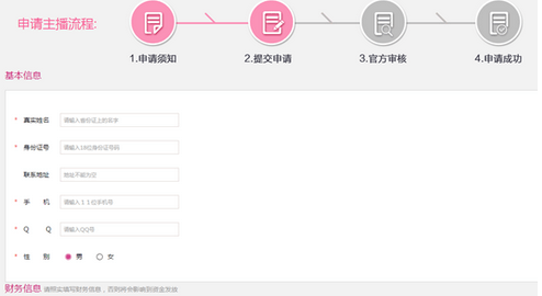 1、注册帐号后,点击首页“主播申请”,进入申请页面
