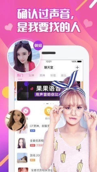 果果语音app是一款实时直播聊天交友软件,海量帅哥美女直播聊天交友,弹幕聊天谈天说地,这里有数不清的美女佳人,缓解你一个人时的无聊,快来一起聊天交友吧!