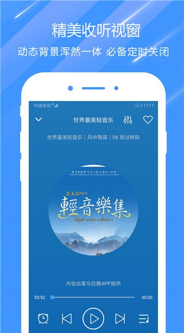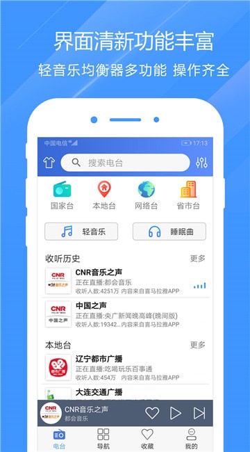 导航分类齐全,涵盖全国各省市1000+电台,还有海量轻_音乐等资源,不受地域限制24小时不间断直播电台。