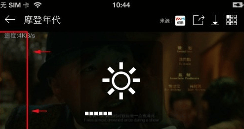 第三步:然后在视频播放界面上,最左边的区域是调节亮度的,最右边的区域是调节音量大小的,操作都是一样,用手指向上滑动调节是增加亮度或者是提高声音音量,手指向下滑动是降低亮度或者是降低声音音量,非常的方便实用。