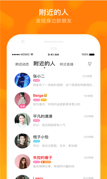 在MOMO,你可以通过视频、文字、语音、图片来展示自己,基于地理位置发现附近的人,加入附近的群组,建立真实、有效、健康的社交关系。