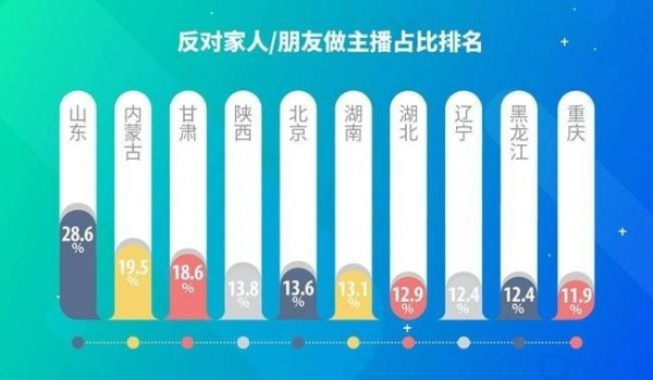 尽管多数主播得到了社会的认可,也有不少主播表示家人、朋友反对自己做主播。其中最反对家人、朋友做直播的TOP5省市为山东、内蒙古、甘肃、陕西、北京,反对比为28.6%,19.5%,18.6%,13.8%,13.6%。认为“主播不是一种职业”的TOP5省市为上海、青海、山东、甘肃、云南,占比为50.3%,48.5%,34.2%,33%,31.7%。对家人、朋友做主播支持率最高的TOP5省市恰好也是主播分布较多的地方,分别为吉林、辽宁、黑龙江、山西、天津,支持占比分别为72.0%,70.2%,69.4%,65.2%,63.6%。