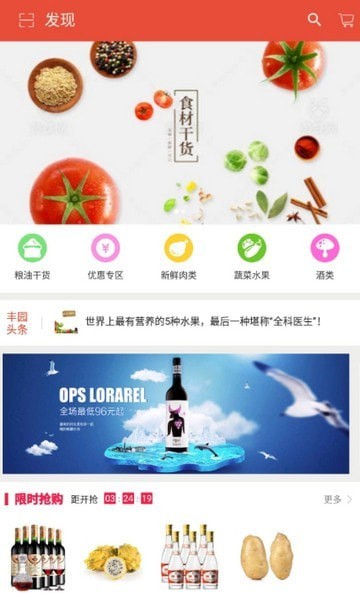 丰园是一款生鲜购物软件,该软件为用户提供的来那个粮油干货、新鲜肉类、蔬菜水果、酒等生鲜食品,用户可以根据需求选择购买,下单之后送货到家,每天这里还有限时抢购活动,有需要的朋友快来下载使用吧!