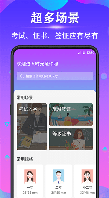 尺寸多样:根据不同证件照特点自动裁切照片;包含国内多种证件照尺寸模板,各国签证等