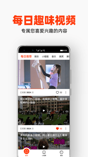每日视频客户端是一款全新短视频互动分享平台,软件内入驻了海量原创短视频达人,聚集全网优质短视频内容,视频动态实时更新,让你随时都能看到喜欢的视频内容,感兴趣的朋友就来下载体验吧!