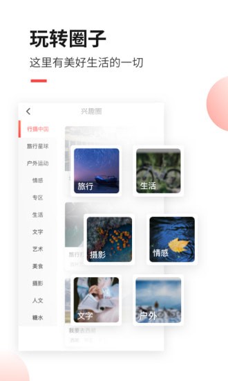 【兴趣交友】-人文旅行、风光摄影、户外运动、骑行自驾、诗歌散文、艺术绘画……各种兴趣圈全部免费开放。结识同道好友,互相交流学习,作品更有机会得到达人大咖的认可与转发。