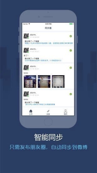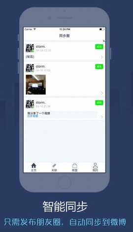 成功关联帐号以后,以后发朋友圈的时候,同步圈会帮你同步复制一份到你的新浪微博上。操作简单,即时同步,快来体验吧