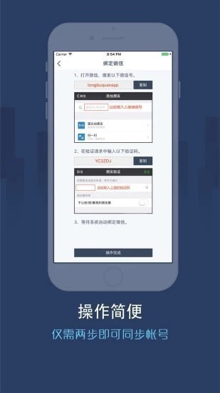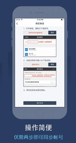 2.绑定微信,添加同步圈为微信好友,在验证申请中输入验证码,成功添加好友后点击确认绑定。