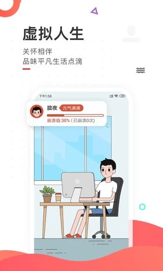 【虚拟人生】:获取你的虚拟人物,给予他你的关心,和他一起品味生活点滴(这里是另一个世界里一个人的平凡生活,你可以看做是’平行世界的你’。康康Ta都在做些什么,Ta每天都会和你分享Ta的生活点滴、喜怒哀乐!有意思的是,Ta还会崩溃,你要做的是,拯救Ta保证Ta不崩溃!)