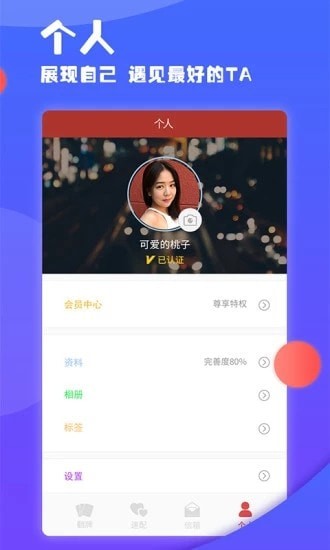 个人中心,查看个人信息或修改信息,方便展示自己,遇见更好的TA;