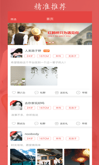 首页:根据征婚条件智能推荐更合适的交友对象。